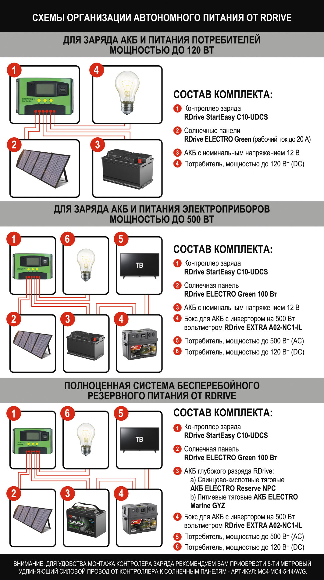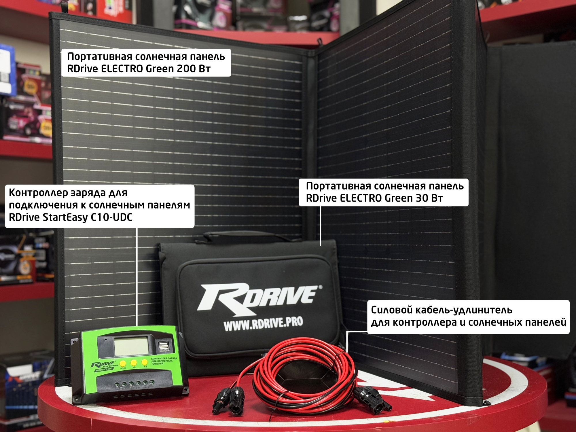 Солнечные панели, контроллер заряда и кабель-удлинитель от RDrive Организация автономного питания с солнечными панелями и контроллером RDriveС помощью комбинации товаров RDrive вы можете организовать автономное питание потребителей разной мощности, ниже приведены возможные схемы: 1. Контроллер заряда для подключения к солнечным панелям RDrive StartEasy C10-UDC 2. Солнечные панели RDrive ELECTRO Green b) Литиевые батареи глубокого разряда RDrive ELECTRO Marine (Lithium) 4. Бокс для АКБ с инвертором и вольтметром RDrive EXTRA A02-NC1-IL 4. Портативные литиевые электростанции